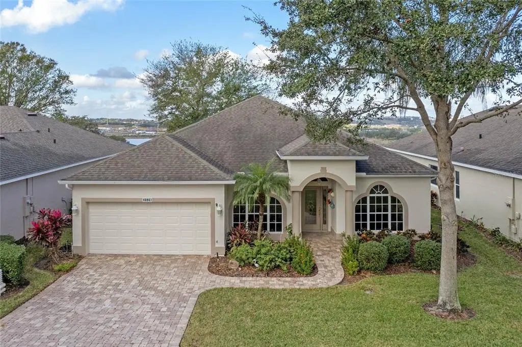 This is your opportunity to enjoy daily GORGEOUS SUNSETS and breathtaking views of Lake Felter with a panoramic overlook of the 9th, 10th, and 11th holes on the renowned Ridge Golf Course all right from your Living Room, Master Bedroom or Back Patio! This picturesque backdrop and expansive screened in lanai make this home truly One-Of-A-Kind. As you step inside you will see a meticulously-maintained interior where the living and dining areas greet you with gray sculpted carpeting and silhouette blinds. The kitchen is equipped with upgraded stainless steel, fingerprint-resistant appliances, enhanced by recessed lighting over a modern sink featuring an instant hot water faucet, Corian countertops and solid maple cabinets enriched with custom molding, all accentuated by a stylish backsplash and additional cabinetry above the eating area with an open view of the living and outdoor area... There is a seamless flow from the kitchen area directly to the family room, showcasing double sliding glass doors complete with plantation shutters to enjoy unobstructed views and privacy. Providing you with the versatility and an option of having a third bedroom is the Den that can easily be converted into a bedroom by installing double doors. Next to the den is the second bedroom with double closets, conveniently located next to the guest bath. As you enter into the master suite you will enjoy direct access to the lanai through triple sliding glass doors equipped with plantation shutters and double closets as well. The large master bath has a spa-like feel with a walk in shower and soak in tub. Step outside to the outdoor Lanai equipped with cool-decking painted flooring and three retractable blinds to ensure shade and comfort while basking in the serene surroundings. Welcoming you with elegance from the driveway and entryway are brick pavers that are complemented by a striking leaded and beveled glass front door for great street and curb appeal. This home is ready to welcome you to an unmatched lifestyle with awe-inspiring views ready for you to make it your own home. Comes fully-equipped with a water softening system and BRAND NEW ROOF in February 2025. Drive your Golf Cart around the neighborhood or Kings Ridge shopping center! Come and enjoy all the outdoor and Club amenities/activities that Kings Ridge has to offer and see why residents love living and enjoy this wonderful community so much!