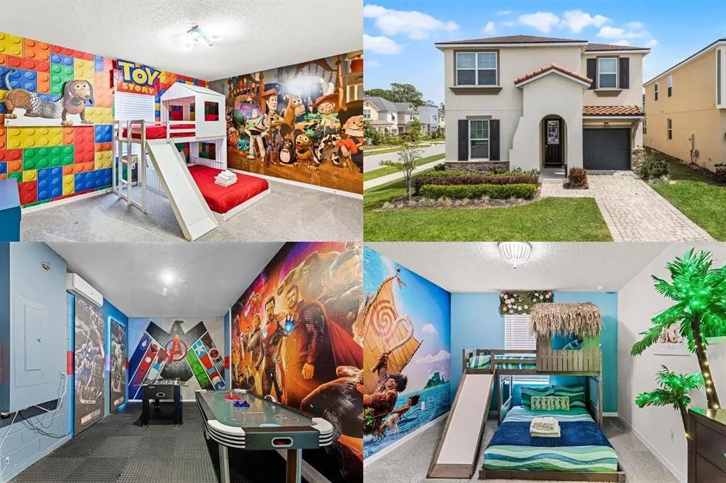 Welcome to this stunning FULLY FURNISHED 7-bedroom, 6.5-bathroom home in the highly sought-after Solara Resort! Designed to accommodate up to 16 guests this home is perfect for short-term rentals, a vacation retreat, or a lucrative investment property. Its estimated nightly rental rate is $376 with a 60% occupancy rate. Entertainment abounds with a converted garage-turned-Avenger-themed game room, complete with foosball and air hockey. Upstairs, a large loft/media area provides additional space for family fun. The home also features Disney-themed bedrooms, including Haunted Mansion, Toy Story, Moana, and Star Wars, creating a magical experience for guests of all ages. This home boasts both lower and upper-level primary bedrooms with ensuite bathrooms, offering flexibility and privacy for owners and guests alike. A convenient upstairs laundry room adds extra ease to your stay. SPACIOUS open-concept kitchen, dining, and great room featuring tile flooring throughout, perfect for entertaining and family gatherings. Step outside onto the screened-in covered porch, featuring a custom-designed OUTDOOR KITCHEN, FIRE PIT, and above-ground HOT TUB—an ideal setting for relaxation and entertaining. Plus, enjoy easy access to an outdoor half bath for added convenience. Located in the amenity-rich Solara Resort, enjoy access to a resort-style pool, clubhouse, fitness center, water park, and more. Just minutes from Disney and Orlando’s top attractions, this home is a turnkey investment opportunity that’s sure to impress. Don’t miss out on this incredible vacation home—schedule your private showing today!