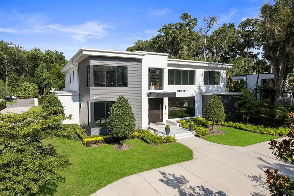 Private setting within the exclusive Lake Maitland Owl Preserve, this spectacular five-bedroom contemporary residence was masterfully built in 2019 by award-winning E2 Homes. A dramatic 12-foot-tall wooden pivot-door makes a striking first impression, opening into a light-filled foyer, gathering, dining, and kitchen wide-open everyday living area with soaring two-story ceilings. A floating staircase becomes an architectural centerpiece, while a sleek linear gas fireplace framed in modern stone design, anchors the living room. Flowing seamlessly into the dining area and chef’s kitchen, the home is designed for both comfort and elevated entertaining. The kitchen is a contemporary showcase, boasting top-of-the-line Wolf and Sub-Zero appliances, a hidden walk-in pantry, and an extraordinary backlit marble feature wall that serves as art and function. Disappearing glass sliders, operated remotely, blur the lines between indoors and out, extending the living space to a covered lanai with multiple sitting and dining areas, a full summer kitchen, and automated screens that protect from sun, rain and the elements. Beyond, a contemporary saltwater pool and spa with water features is framed by a sweeping lawn and thoughtfully designed herb garden with raised beds. The first-floor primary suite offers a serene retreat with a custom walk-in closet and spa-inspired bath featuring a striking tub/shower combination wet room. Also on the main level is a fifth bedroom used as a home office, complete with an en-suite bath. Upstairs living areas include a flexible loft/lounge area at the top of the stairs and leading to two flanked secondary bedrooms, and a fourth junior suite with spacious bath/walk-in closet, then anchored with access to a spacious outdoor balcony overlooking the pool and grounds. Additional highlights include beautiful porcelain tile and elegant dark wood flooring throughout, a three-car side-entry garage, and a circular drive. Secluded, but ideally located, the home offers a tranquil, preserve setting while remaining just minutes from Park Avenue’s fine shops and dining, Maitland’s cultural corridor and with convenient access to top-rated schools, downtown Orlando, and the International and Executive airports.