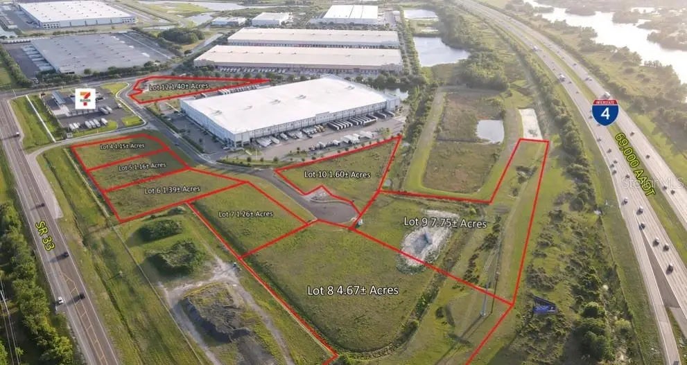 Firstpark at Bridgewater is a developed commercial park ideally located at I-4 and SR 33 in Lakeland, FL. Existing tenants in the park include Haverty's, HD Supply, Walmart, Empire Flooring to name a few. The opportunity is to join 7-11 and purchase the developed retail/commercial parcels ranging in size from 1 to 7.75 acres fronting along I-4 and SR 33. The parcels are being sold cleared, filled with the spine road, curb, and offsite master retention already in place. Each pad will include 50 trip count allocation with additional trip count requirements to be purchased at an additional cost. The parcels also benefit from being across the street from the new Florida Polyphonic Connector Road into the growing campus. With over 100,000 cars driving by this property daily, it is prime for hotel, retail and commercial development. Lot 12 is no longer available.